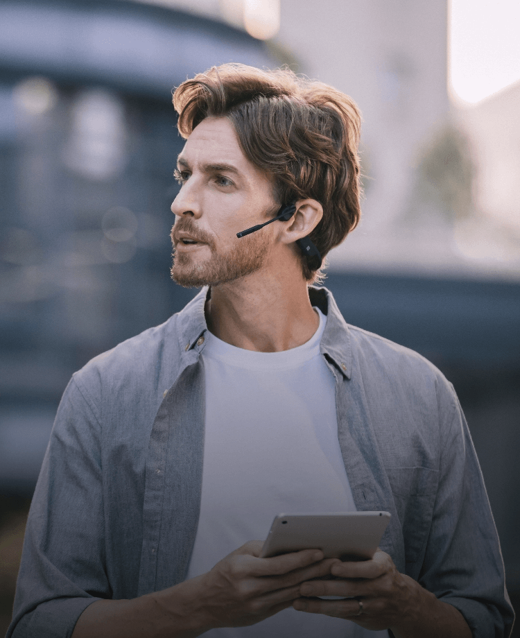 Dankzij het open-ear ontwerp blijft u verbonden met uw omgeving en blijft u zich bewust van de voetgangers/voertuigen op de weg en dat is wel zo veilig. Tegelijkertijd kunt u gemakkelijk uw audio regelen, duidelijk communiceren en te allen tijde verbonden blijven met uw werk.