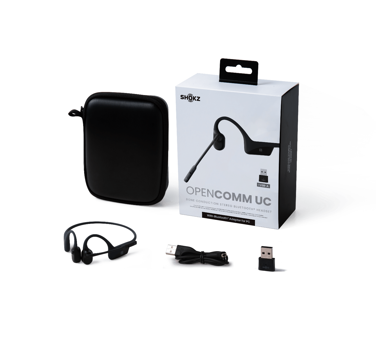 De koptelefoon heeft een magnetische oplaadpoort net als de OpenComm, terwijl de dongle een USB-A poort gebruikt.